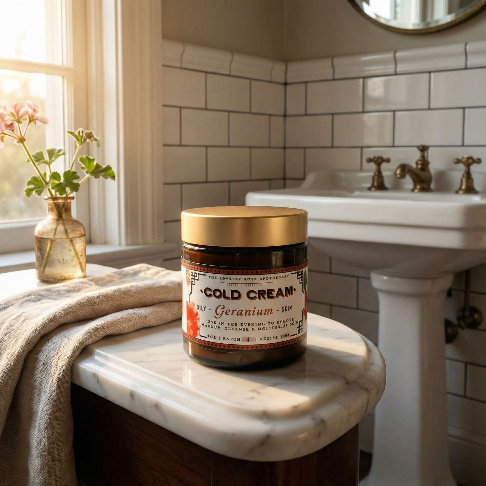 Geranium Cold Cream Ingredients: Jojoba esters, Beeswax, Almond oil, Geranium hydrosol, Borax, Perilla seed oil, Geranium essential oil, Linaturel (preservative) 4oz